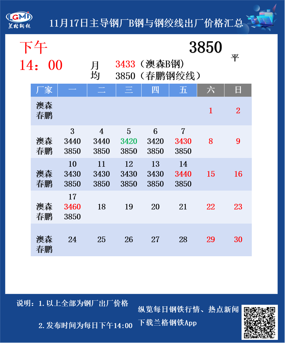 • 11月17日主导钢厂B钢与钢绞线出厂价格