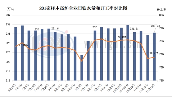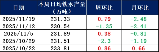 2025年11月19日,据兰格调研,全国201家生产企业铁水日均产量为231.33万吨,较上周增加0.79万吨,总体月环比减少2.48万吨;25年9月日均铁水产量为230.14万吨,10月日均铁水产量为232.74万吨,11月日均铁水产量为231.25万吨。 本周铁水总量较上周小幅增多,主要在于虽有个别高炉新增检修,但前期检修高炉重启,抵冲铁水减少之量,铁水整体表现增多。近期东北、华北、西北区域天气处于寒冷节气,部分工程项目成品材需求转弱,部分钢企转产坯料为主,发往各地进行消化。近期北方市场环保限产仍在继续,部分高炉后期生产或将有所影响。