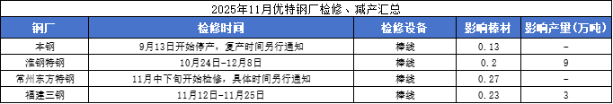 • 2025年11月优特钢厂检修、减产汇总