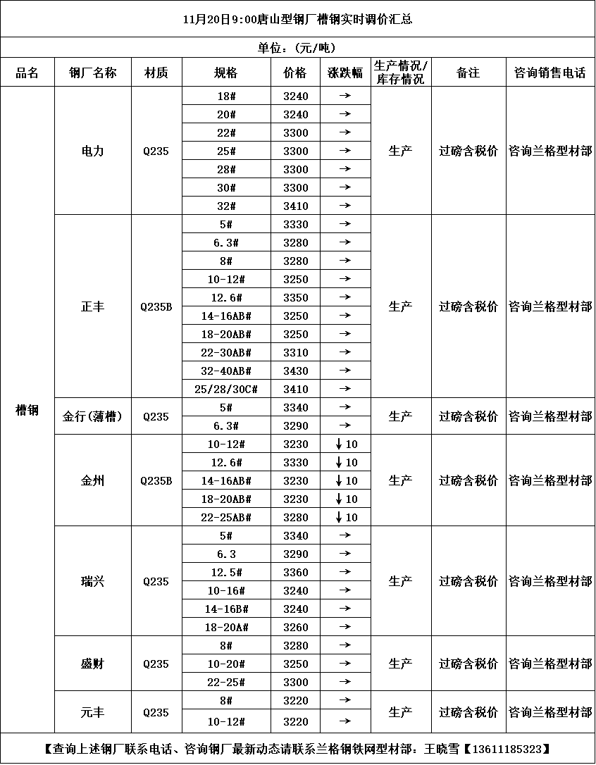 • 11月20日9:00唐山型钢厂槽钢实时调价汇总