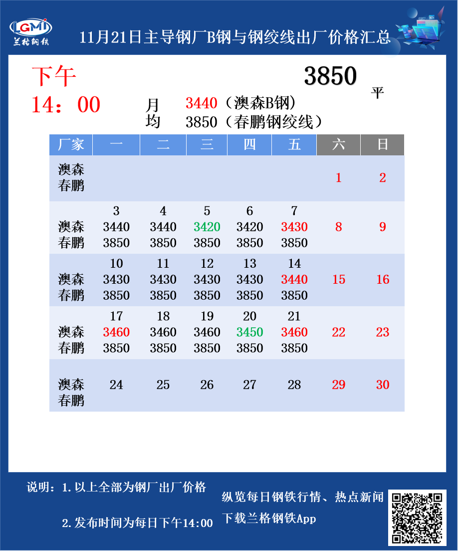 • 11月21日主导钢厂B钢与钢绞线出厂价格