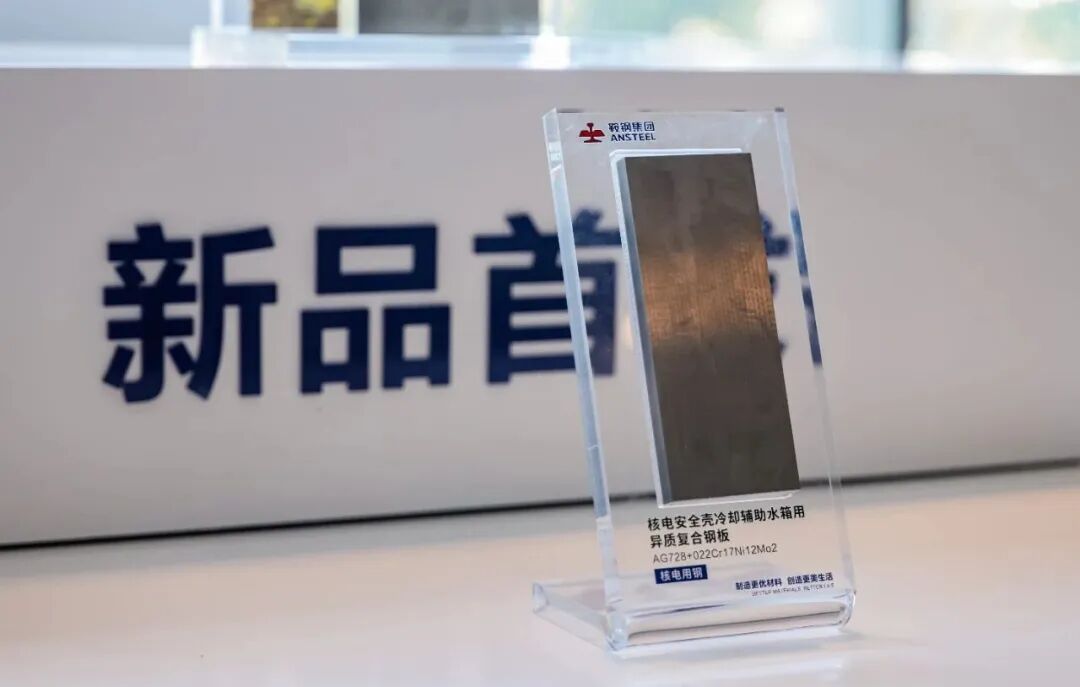 核电安全壳冷却辅助水箱用异质复合钢——AG728+022Cr17Ni12Mo2:鞍钢集团联合设计单位历时两年研制,率先应用于三代非能动压水堆核电机组。与奥氏体不锈钢相比,抗拉强度大幅提升,综合成本显著下降。攻克组坯焊接、超宽板幅等难题,成功生产宽度3700mm超宽规格产品,通过严苛焊接与应用评价。作为核电装备特殊工况材料创新成果,为我国核电技术升级提供重要支撑。