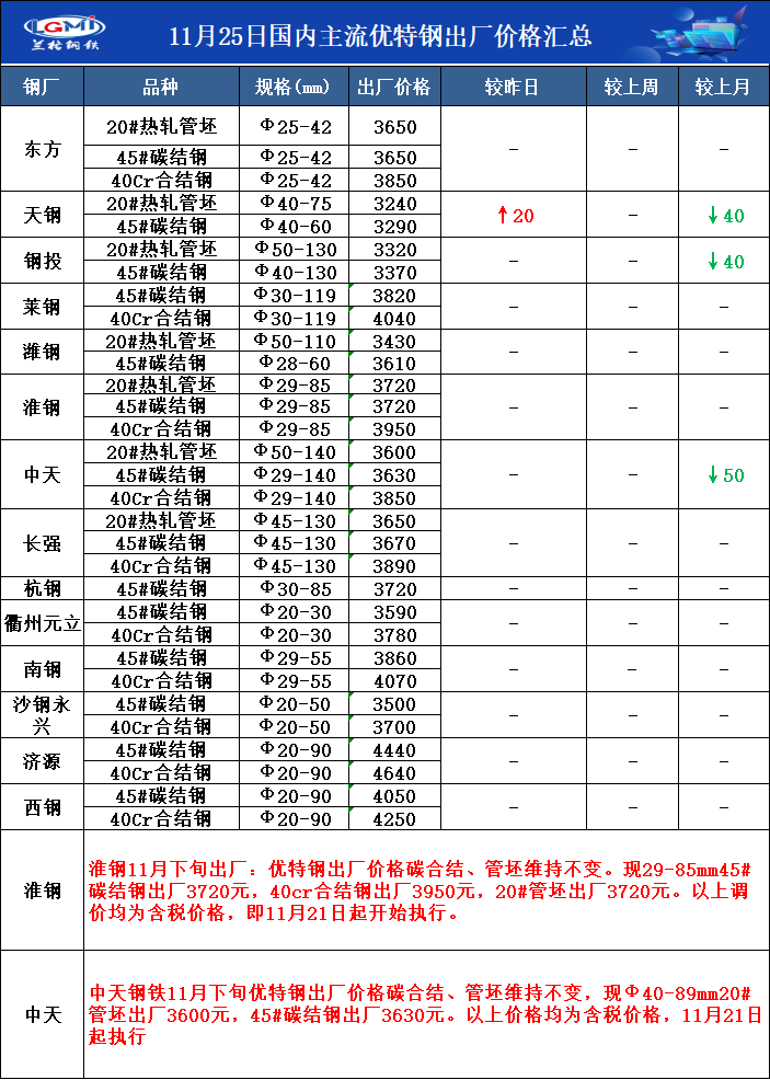 • 11月25日国内主流优特钢出厂价格汇总