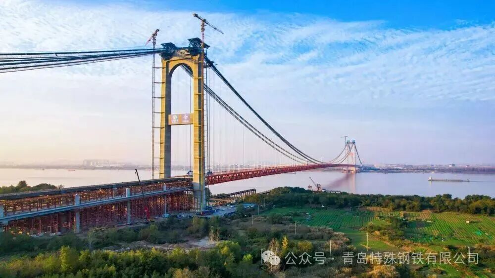 世界最大跨度四主缆悬索桥 湖北燕矶长江大桥达成主桥合龙, 这一成果标志着 中国桥梁技术再度屹立于世界前沿。 在这项总用钢丝量可环绕地球八圈的超级工程中, 青岛特钢研发制造的 2100 兆帕超高性能桥梁缆索镀锌钢丝 以世界级的强度与稳定性, 为这座“悬浮于江上的钢铁长城” 注入了强大的“青钢力量”。