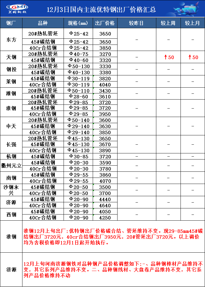 • 12月1日衢州元立优特钢出厂价格上调20元
