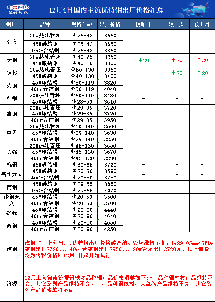 • 12月1日衢州元立优特钢出厂价格上调20元