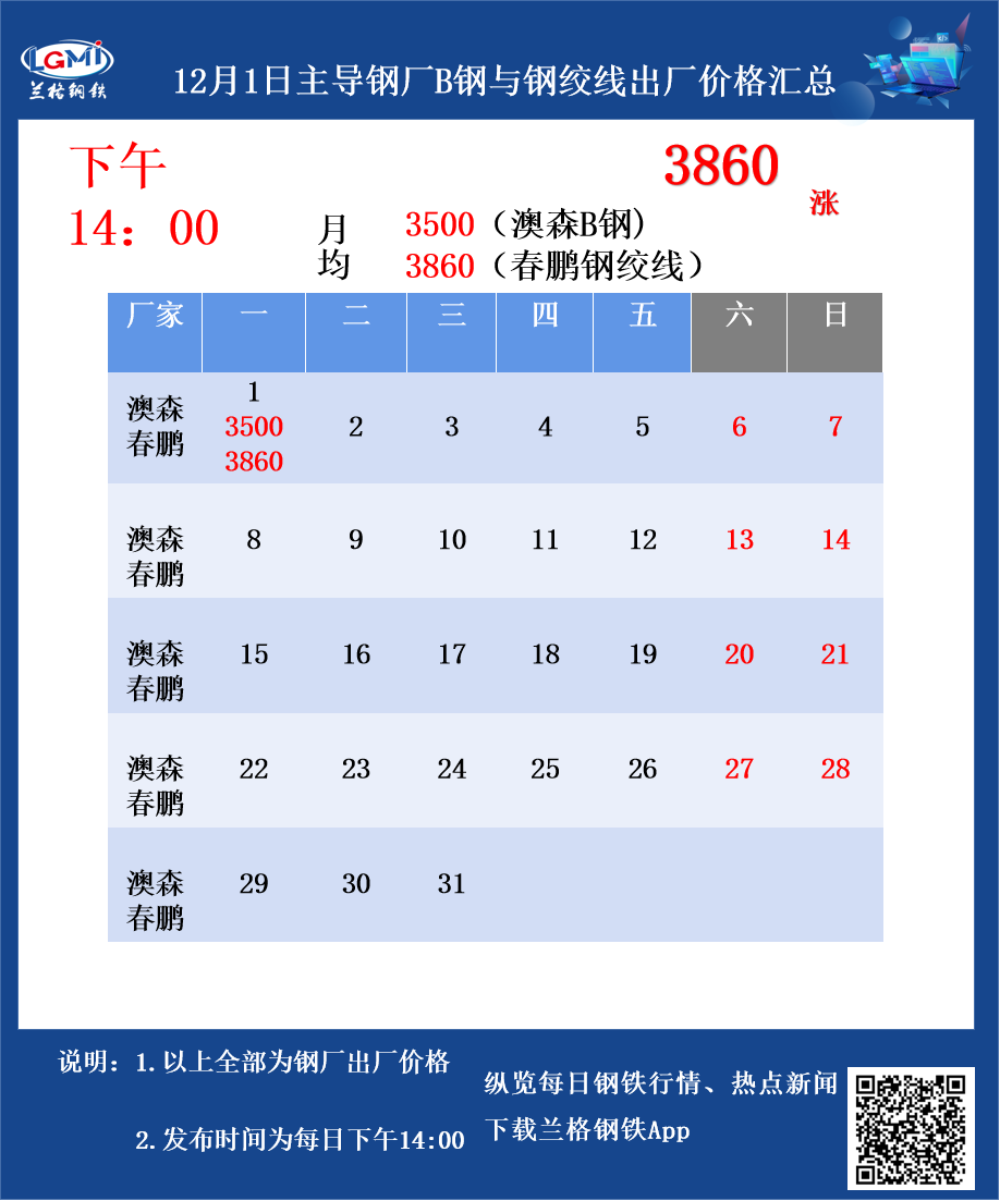 • 12月1日主导钢厂B钢与钢绞线出厂价格