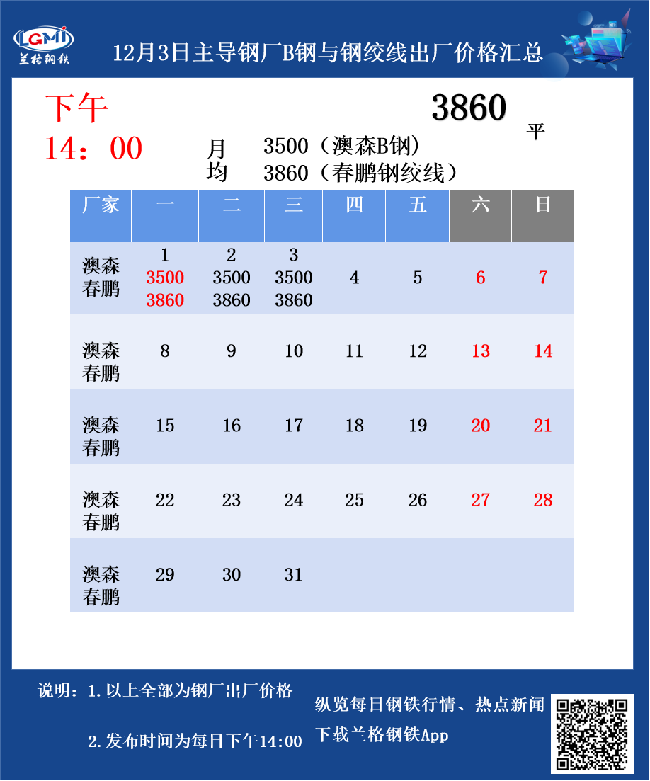 • 12月3日主导钢厂B钢与钢绞线出厂价格