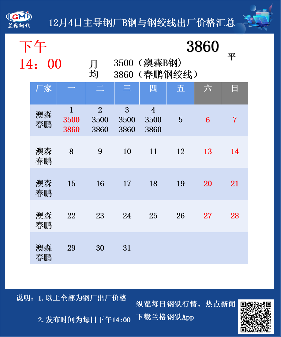 • 12月4日主导钢厂B钢与钢绞线出厂价格