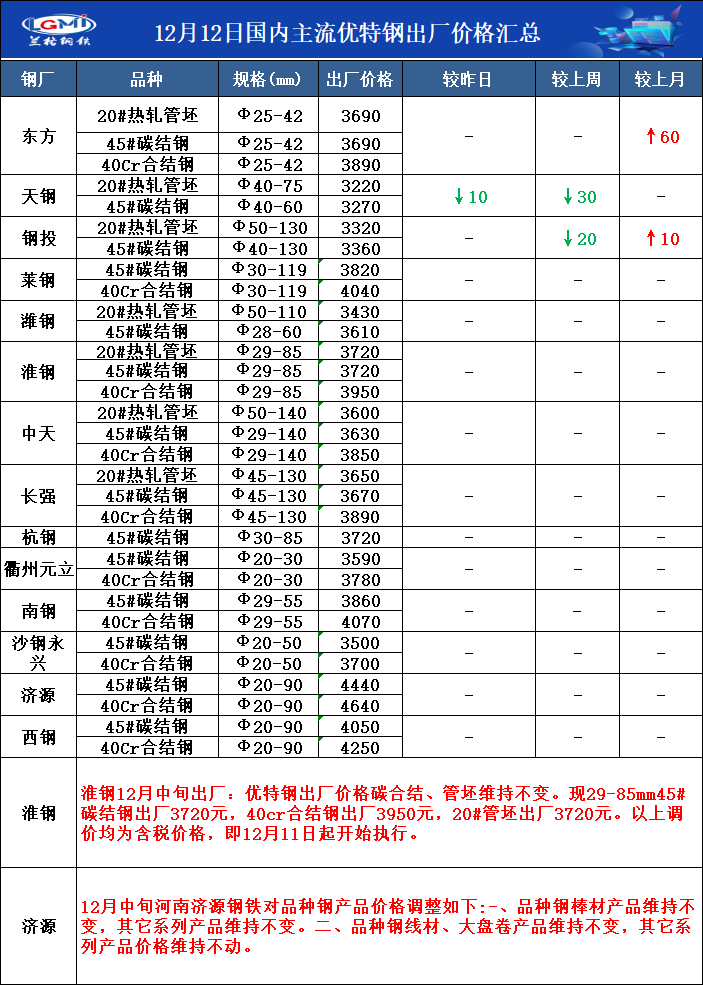 • 12月12日国内主流优特钢出厂价格汇总