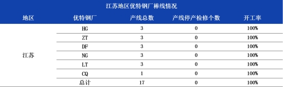 截至12月17日,江苏地区6家钢厂总棒线17条,开工17条,整体开工100%,周环比持平。本周优特钢厂正常生产。