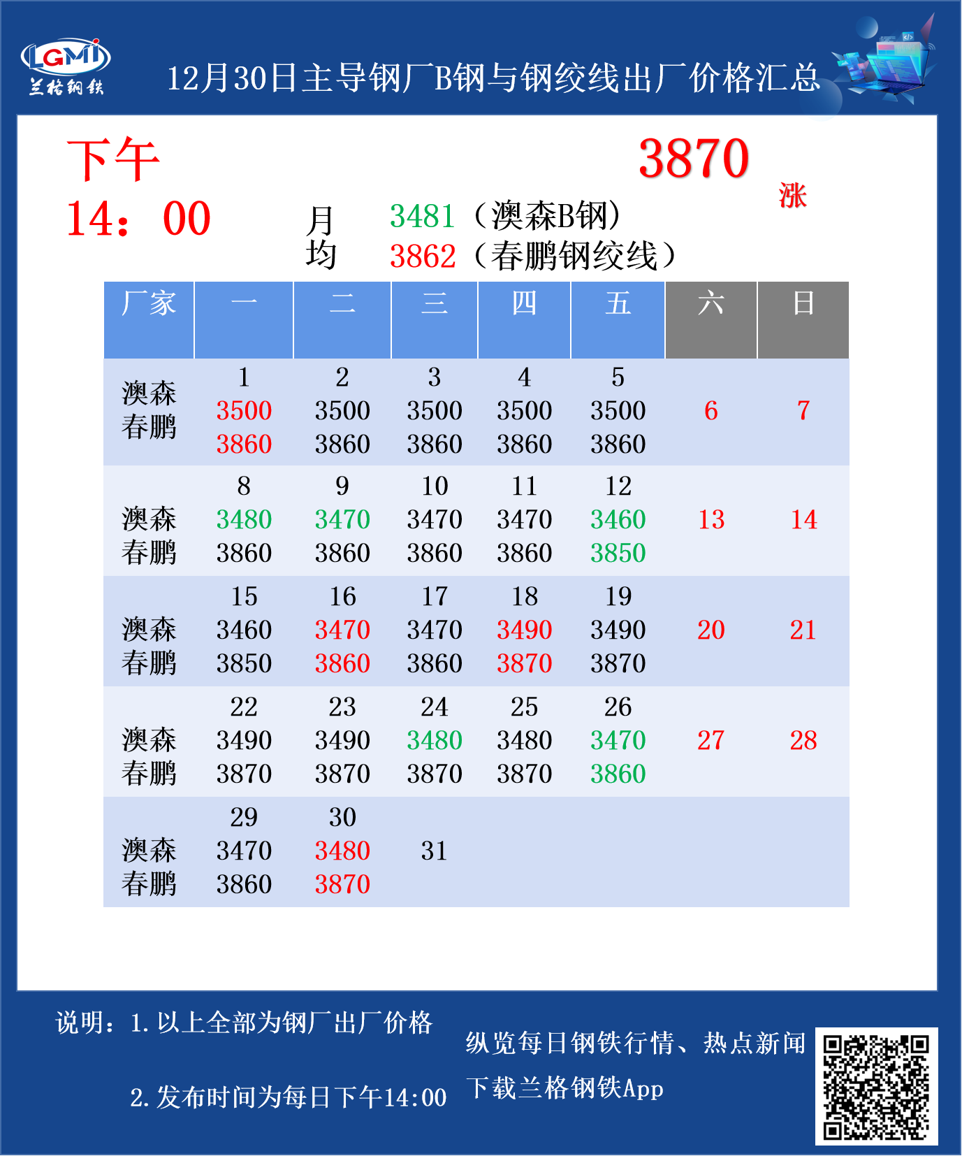 • 12月30日主导钢厂B钢与钢绞线出厂价格