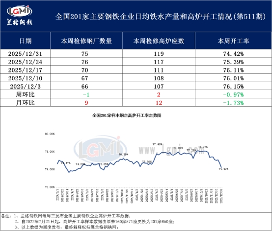 一、全国201家生产企业高炉开工周度数据处于下降区间 据兰格钢铁网监测数据显示,2025年12月31日全国201家生产企业中有75家钢厂共计119座高炉检修停产,总容积为132990立方米,较上周增加10260立方米,按容积计算主要钢铁企业高炉开工率为74.42%,较上周下降0.97个百分点。 从数据可见,本周全国主要钢铁企业高炉检修率呈现小幅增加态势,具体来看,本周新增检修高炉主要集中在华北、华东地区,主要是受到前期环保限产政策收紧影响,加之近期原燃料价格运行呈现波动趋势,各钢材产品利润空间并未修复,部分钢厂维持较低的生产积极性,选择阶段性检修以规避市场风险。另外,从钢厂反馈消息来看,前期部分提前进入高炉检修期的钢厂,已陆续临近检修期尾声,预计后续随着检修周期的推进,部分钢厂或在2025年12月下旬至2026年1月份上旬逐步恢复生产,好在随着元旦假期临近,部分计划复产的钢厂或推迟至节后启动,短期内全国钢厂高炉开工率或维持在相对低位,对钢材市场供应端压力或有一定缓解趋势。