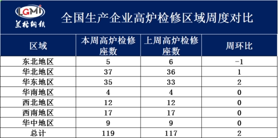 二、全国生产企业高炉检修区域对比 据兰格调研:201家样本高炉企业中,有119座高炉检修,较上周增加2座。其中:东北地区5座高炉检修,较上周减少1座;华北地区37座高炉检修,较上周增加1座;华东地区35座高炉检修,较上周增加2座;华南地区4座高炉检修,较上周持平;西北地区12座高炉检修,较上周持平;西南地区17座高炉检修,较上周持平;华中地区9座高炉检修,较上周持平。