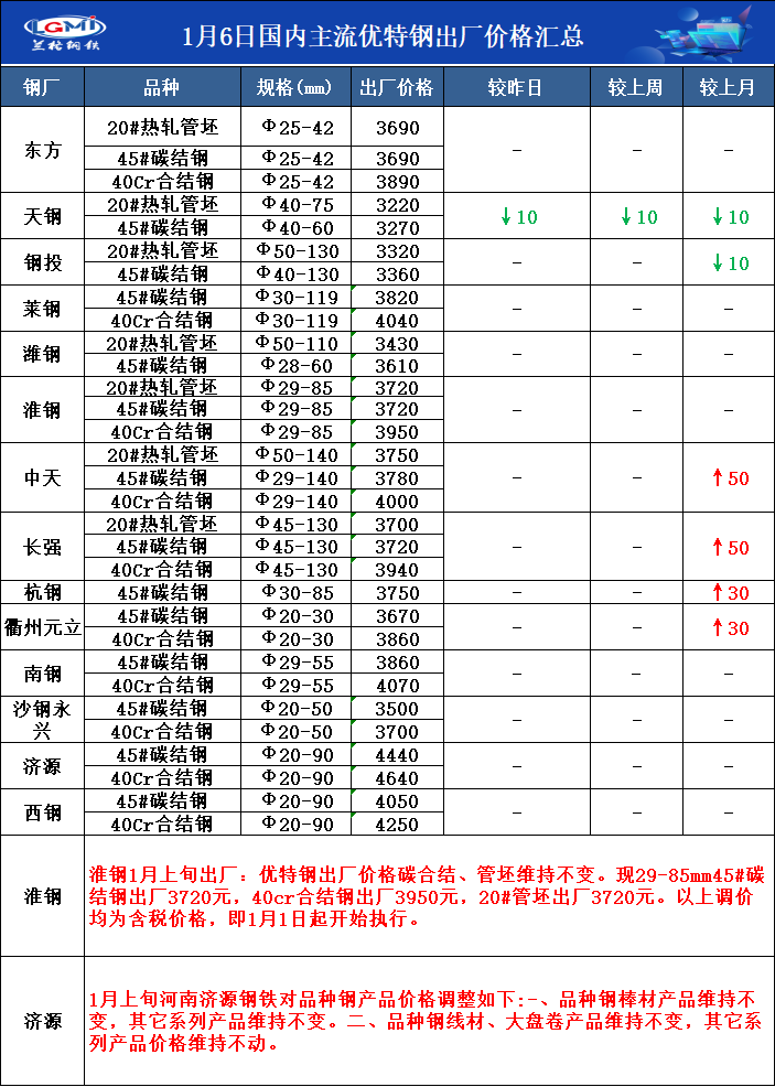 1月6日国内主流优特钢出厂价格汇总