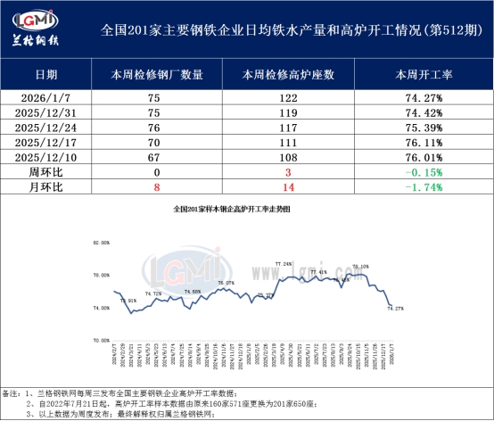 一、全国201家生产企业高炉开工周度数据降幅放缓 据兰格钢铁网监测数据显示,2026年1月7日全国201家生产企业中有75家钢厂共计122座高炉检修停产,总容积为134590立方米,较上周增加1600立方米,按容积计算主要钢铁企业高炉开工率为74.27%,较上周下降0.15个百分点。 目前样本企业高炉开工率已连续三周呈现下降趋势,西北区域高炉存在大规模新增检修情况,但从数据可见,新增检修容积并未凸显大规模集中检修的迹象,主要是因近期华东、华南区域有大型高炉复产,一定程度上对冲了西北区域的检修减量,使得整体开工率下降幅度相对有限。综合来看,当前钢材市场价格持续低位运行,钢厂盈利空间被严重挤压,部分企业面临亏损压力,因此检修意愿依然较强,尤其是对一些炉龄较长、能耗较高的高炉,钢厂更倾向于进行阶段性检修以严控成本,不过随着部分前期检修高炉陆续复产,后期高炉开工率或逐步企稳,但整体回升幅度或较为有限。一方面,当前钢材市场需求仍处于季节性淡季,终端采购积极性不高,市场成交持续疲软,钢厂面临较大的销售和库存压力,这在一定程度上会抑制钢厂的复产意愿。另一方面,原燃料价格虽有波动,但整体仍处于相对高位,钢厂生产成本压力犹存,在盈利空间未得到实质性改善之前,钢厂对于大规模复产仍会持谨慎态度,因此,预计短期内全国主要钢铁企业高炉开工率将维持在当前偏低水平窄幅波动。