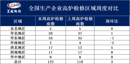 二、全国生产企业高炉检修区域对比 据兰格调研:201家样本高炉企业中,有122座高炉检修,较上周增加3座。其中:东北地区5座高炉检修,较上周持平;华北地区38座高炉检修,较上周增加1座;华东地区34座高炉检修,较上周减少1座;华南地区2座高炉检修,较上周减少2座;西北地区17座高炉检修,较上周增加5座;西南地区17座高炉检修,较上周持平;华中地区9座高炉检修,较上周持平。