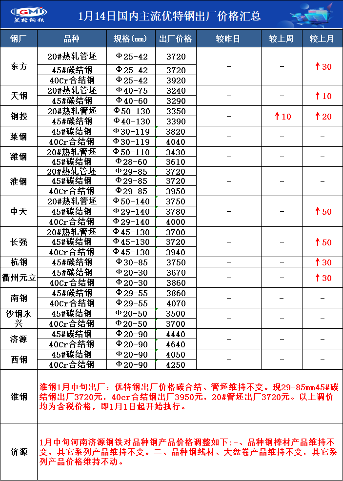 • 1月14日国内主流优特钢出厂价格汇总
