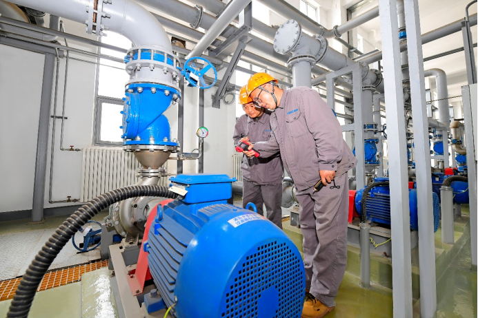 1月9日,河钢集团唐钢公司动力部职工正在水处理中心点检过滤器反洗泵相关设备。