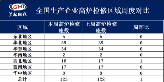 二、全国生产企业高炉检修区域对比 据兰格调研:201家样本高炉企业中,有123座高炉检修,较上周增加1座。其中:东北地区5座高炉检修,较上周持平;华北地区39座高炉检修,较上周持平;华东地区34座高炉检修,较上周持平;华南地区2座高炉检修,较上周持平;西北地区18座高炉检修,较上周增加1座;西南地区17座高炉检修,较上周持平;华中地区8座高炉检修,较上周持平。
