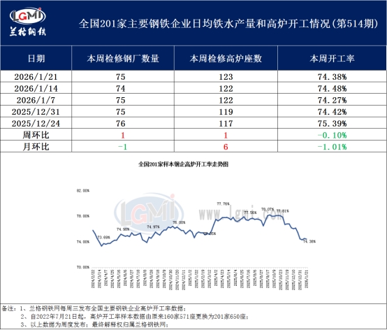 一、全国201家生产企业高炉开工周度数据降幅放缓 据兰格钢铁网监测数据显示,2026年1月21日全国201家生产企业中有75家钢厂共计123座高炉检修停产,总容积为133500立方米,较上周增加1080立方米,按容积计算主要钢铁企业高炉开工率为74.38%,较上周下降0.1个百分点。 从数据可见,201家生产企业高炉开工率再度呈现下降趋势,但整体降幅相比前期明显收窄,主要是因目前西北、东北地区大部分样本企业已按照既定计划停炉休市,华北地区虽也处于淡季市场氛围,但相比上述地区,区域内仍有刚需订单支撑,因此短期内大规模检修、减产的可能性较低,企业生产节奏相对平稳。此外,华东地区部分企业在节前赶制订单,也在一定程度上对冲了其他区域的检修减量影响,使得全国高炉开工率的下降幅度进一步收窄,与历史同期数据对比来看,2026年1月下旬的高炉开工率略低,显示出当前生产端整体呈现弱稳态势,市场对于节后需求回暖的预期也在一定程度上抑制了企业过度减产的意愿。