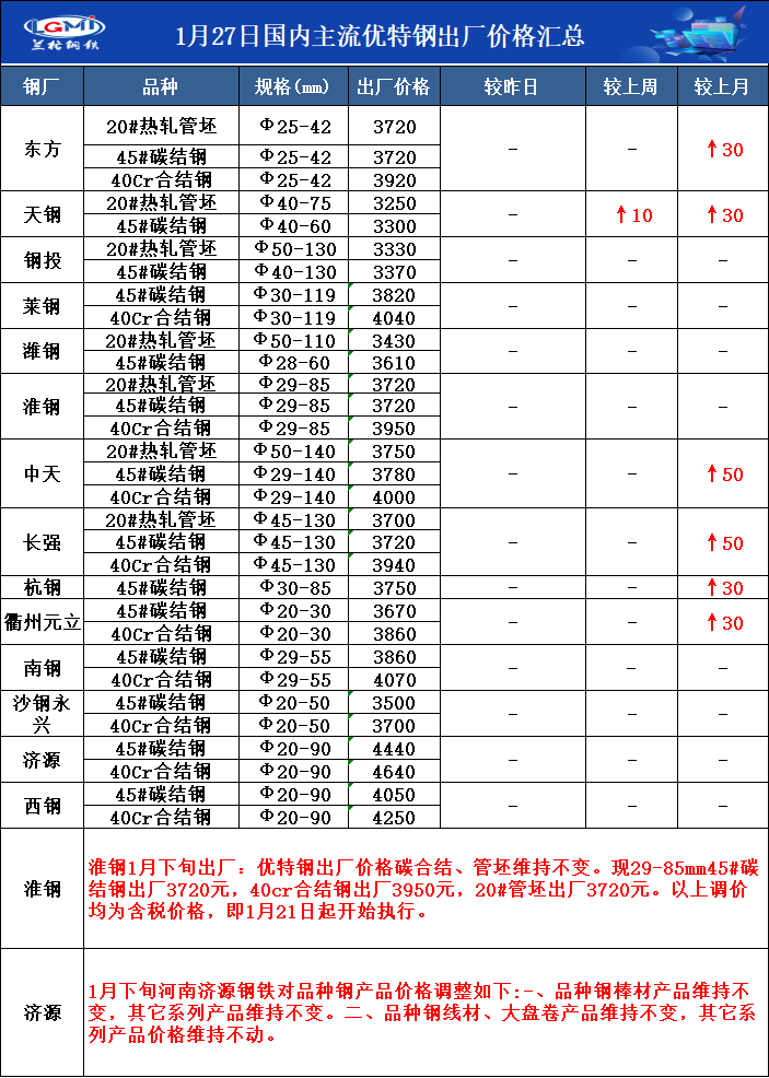 • 1月27日国内主流优特钢出厂价格汇总