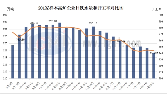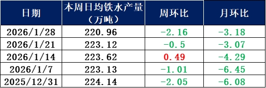 2026年1月28日,据兰格调研,全国201家生产企业铁水日均产量为220.96万吨,较上周减少2.16万吨,总体月环比减少3.18万吨;25年12月日均铁水产量为227.61万吨,26年1月份日均铁水产量为222.71万吨。 从数据可见,201家生产企业高炉开工率持续下滑,主要在于西北、东北区域仍有高炉新增停产,该区域基本进入寒冻时节,市场需求大幅下滑,钢厂提前停产进行检修,规避仓库储备过多风险,其他区域高炉基本保持稳定,近期北方市场需求进入淡季,钢材需求量呈现下滑之势,且随着年节临近,部分终端有提前放假趋势,节前备货情况寥寥无几,部分钢企铁水有小幅减量调整。而南方市场需求相对较好,尤其华东区域,近期钢材需求仍存,部分钢企产量保持正常,供应稳定,部分买方节前有所备货,市场成交在全国基本属于较好水平。结合目前趋势来看,部分钢企对后市仍有较好预期,短期大幅减产情况较难发生,预计短期钢厂铁水产量基本处在持平状态。