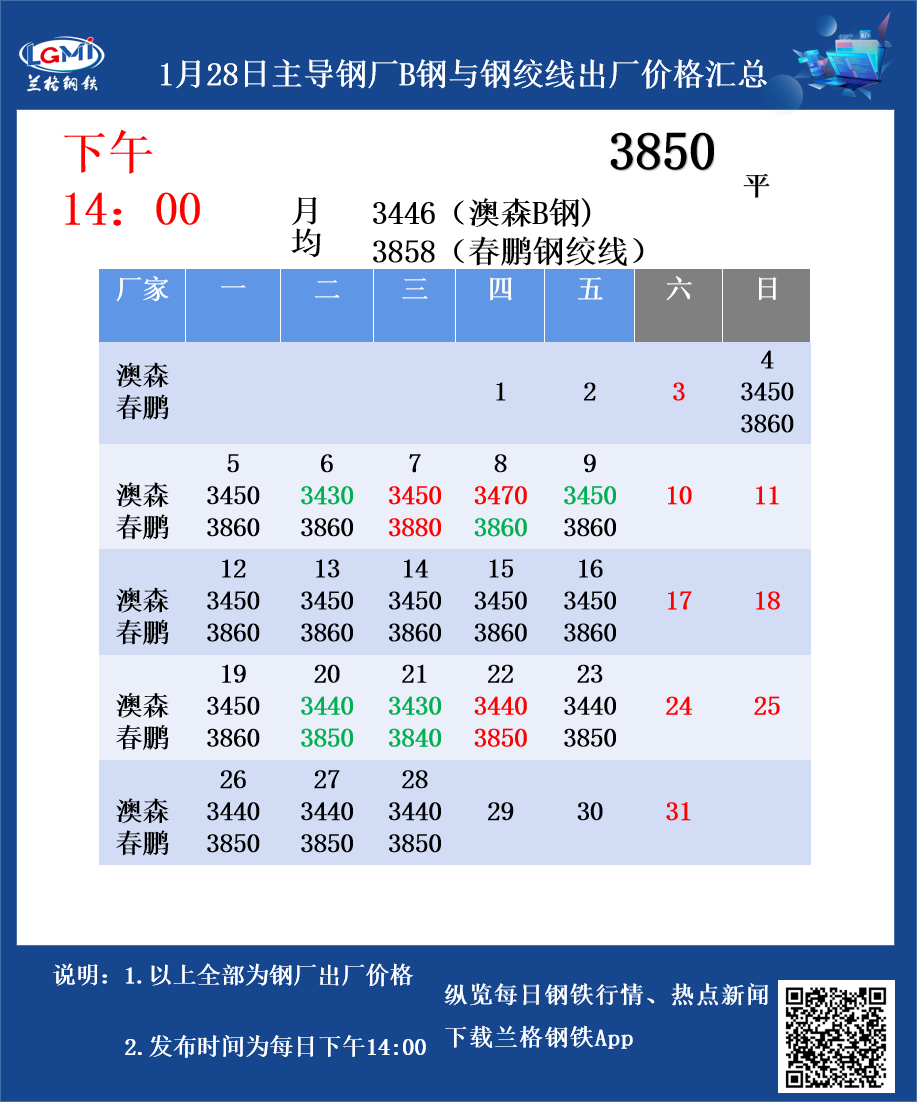 • 1月28日主导钢厂B钢与钢绞线出厂价格