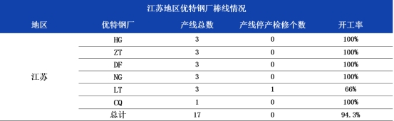 截至2月4日,江苏地区6家钢厂总棒线17条,开工16条,整体开工94.3%,周环比持平。本周龙腾特钢1条棒材轧线检修,其余优特钢厂正常生产。