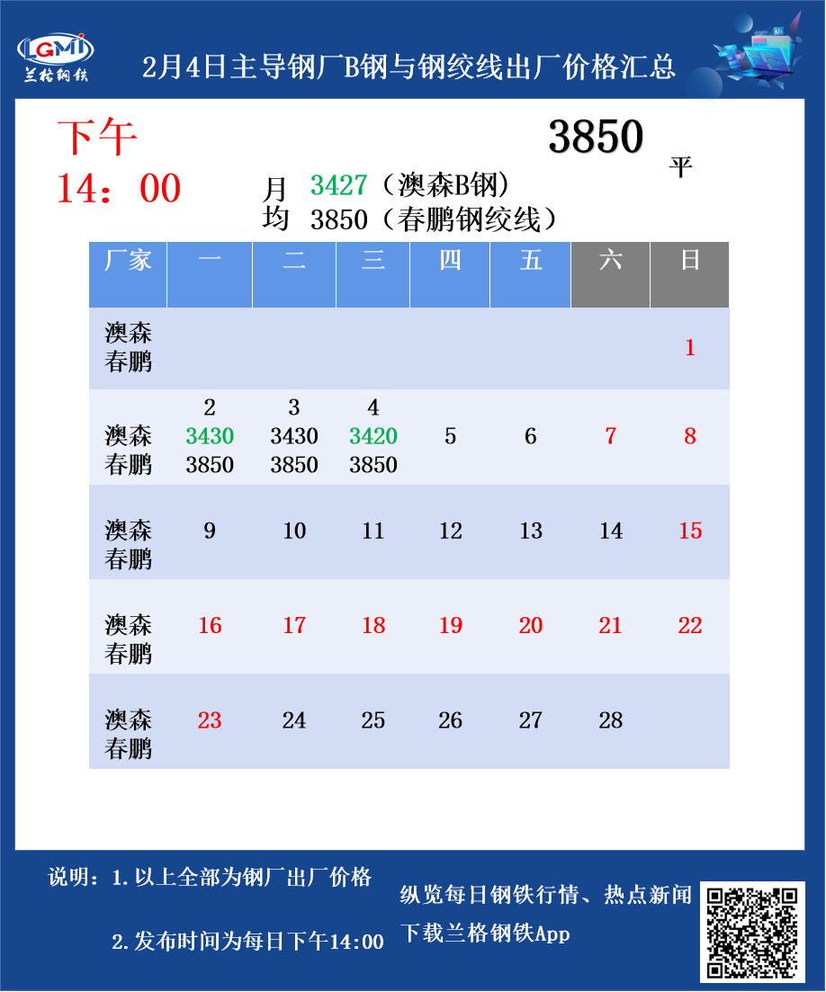 • 2月4日主导钢厂B钢与钢绞线出厂价格