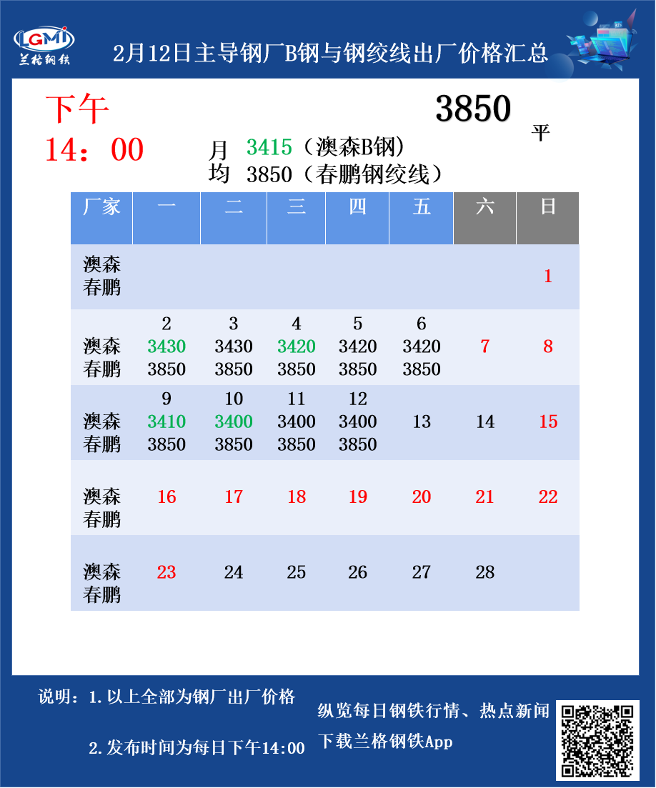 • 2月12日主导钢厂B钢与钢绞线出厂价格