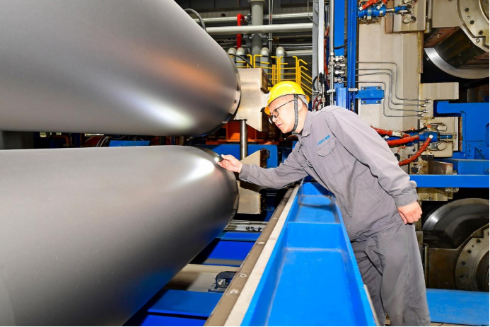 2月9日,河钢集团唐钢公司汽车板材有限公司职工正在二镀锌产线检查准备上线的光整机工作辊表面质量。