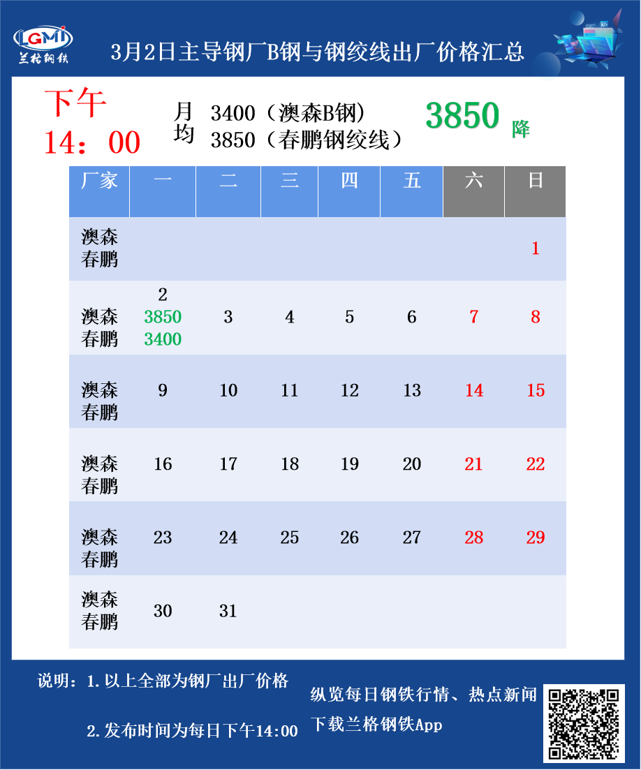 • 3月2日主导钢厂B钢与钢绞线出厂价格