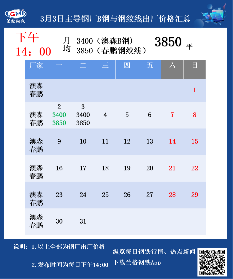 • 3月3日主导钢厂B钢与钢绞线出厂价格