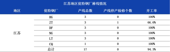截至3月4日,江苏地区6家钢厂总棒线17条,开工16条,整体开工94.3%,周环比持平。本周中天特钢1条棒材轧线检修,其余优特钢厂正常生产。