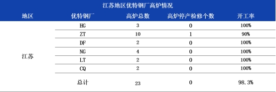 以下为具体指标表现情况: 截至3月4日,据兰格调研,江苏6家样本钢厂,总高炉容积36030m3,开工98.3%,与上周开工率上升6.6%。本周中天特钢1座高炉检修,省内其他优特钢厂正常生产。