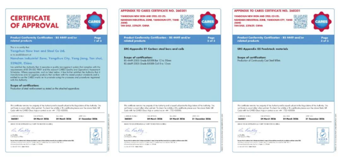 CARES(Certification Authority for Reinforcing Steels)是全球建筑用钢筋领域最具权威性的认证机构之一,其认证标准以严苛性、专业性著称,在行业内拥有极高公信力。此次认证范围涵盖质量管理体系ISO 9001:2015,以及英国、新加坡、中国香港多项国际和区域产品认定标准。 英国标准证书