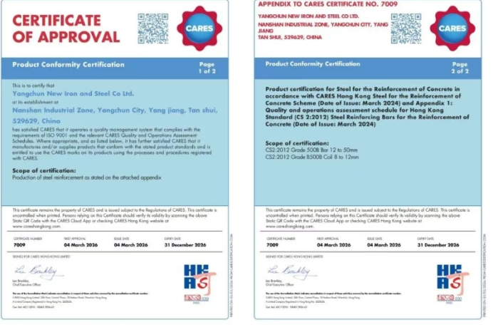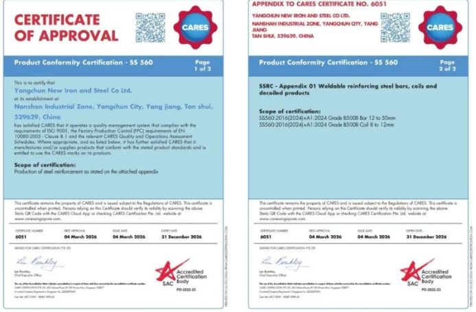 本次CARES认证的通过,是公司践行“建材高端化、品种高占比” 双轮驱动战略的重要成果。在阳春新钢铁已实现建筑材品种规格全覆盖的基础上,此次B500B顺利通过验证,为公司拓展国际市场提供了核心资质保障。 |
