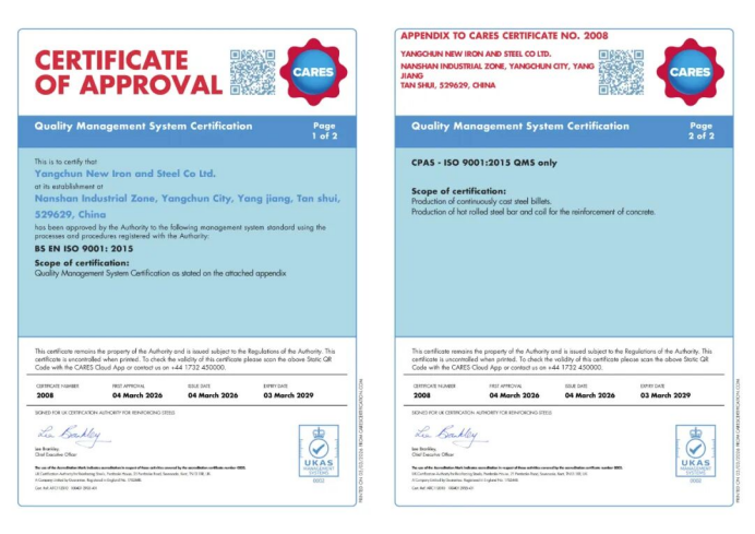 近日,阳春新钢铁产品B500B钢筋顺利通过英国CARES出口认证。 ISO 9001:2015质量体系证书