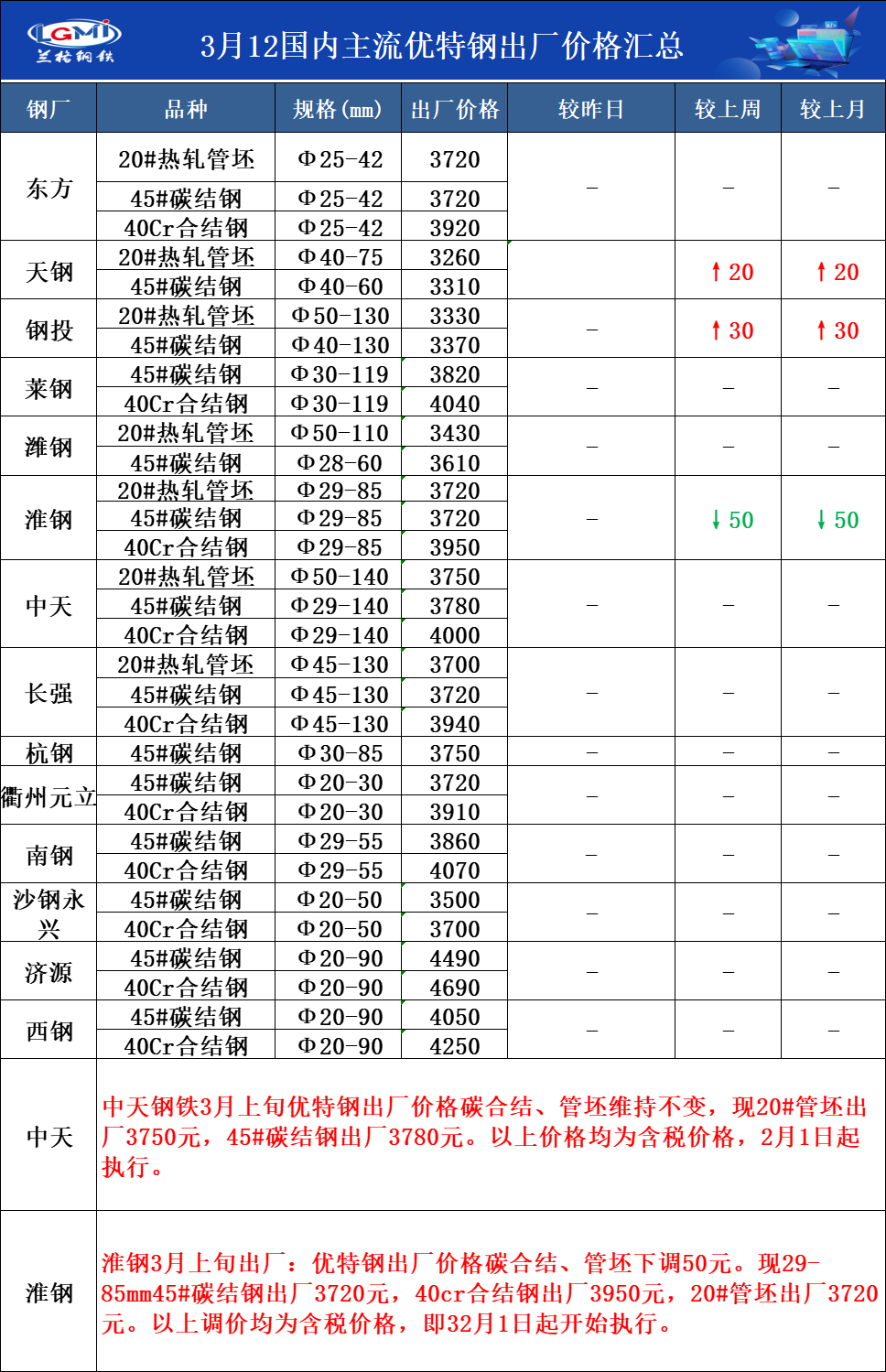 • 3月12日国内主流优特钢出厂价格汇总