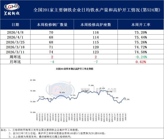 一、全国201家生产企业高炉开工周度数据环比下降 据兰格钢铁网监测数据显示,2026年4月8日全国201家生产企业中有70家钢厂共计116座高炉检修停产,总容积为124720立方米,较上周增加2430立方米,按容积计算主要钢铁企业高炉开工率为75.2%,较上周下降0.24个百分点。 从数据可见,本周国内钢铁企业高炉开工率呈现小幅回落态势,检修高炉容积环比有所增加,反映出部分样本钢厂在利润承压及库存压力背景下,主动调整生产节奏以缓解供需矛盾。从区域分布来看,检修高炉主要集中在西北、华东等地区,目前高炉开工率小幅回落更多体现为钢厂的阶段性策略调整,而非系统性减产,多为一周左右的检修周期,尤其是当前市场正处于传统消费旺季,虽然需求并未大规模启动,但部分钢厂对于旺季需求仍存一定预期,大规模主动减产的意愿并不强烈。结合生产成本来看,近期铁矿石、焦炭等原料价格虽有波动,但整体仍处于相对平稳的运行区间,价格底部支撑力度较强,这也限制了钢厂进一步大幅缩减产能的主动性,短期内国内高炉开工率大概率维持在当前水平窄幅波动。