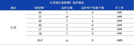 以下为具体指标表现情况: 截至4月8日,据兰格调研,江苏6家样本钢厂,总高炉容积36030m3,开工100%,与上周开工率持平。本周省内优特钢厂均正常生产。
