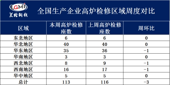 二、全国生产企业高炉检修区域对比 据兰格调研:201家样本高炉企业中,有113座高炉检修,较上周减少3座。其中:东北地区6座高炉检修,较上周持平;华北地区40座高炉检修,较上周持平;华东地区35座高炉检修,较上周减少1座;华南地区3座高炉检修,较上周持平;西北地区8座高炉检修,较上周减少1座;西南地区16座高炉检修,较上周减少1座;华中地区5座高炉检修,较上周持平。