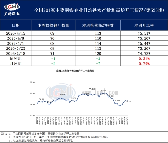 一、全国201家生产企业高炉开工周度数据环比上升 据兰格钢铁网监测数据显示,2026年4月15日全国201家生产企业中有69家钢厂共计113座高炉检修停产,总容积为121520立方米,较上周减少3200立方米,按容积计算主要钢铁企业高炉开工率为75.51%,较上周上升0.31个百分点。 从数据可见,目前全国高炉开工率整体呈现上升态势,随着个别检修高炉回复生产,钢厂生产活跃度有所提升,市场钢材供应量短期内将保持旺盛。结合需求来看,目前处于传统消费旺季,下游市场如汽车、家电、基建等项目对钢材的实际需求仍未达到预期,虽然国际层面陆续有利好政策出台,但各地终端行业信心恢复缓慢,尤其是长协订单增长略显乏力,导致整体采购量难以出现大幅增量。另外,从供求结构来看,当前市场仍然面临供强需弱的局面,尽管近期各地库存量呈现降库趋势,但库存总量仍处于相对高位,叠加国内市场陆续有检修高炉复产,供应节奏或将加快,因此短期内市场供需平衡压力依然较大。整体来看,在高炉开工率回升、供应端压力增大以及需求端恢复缓慢等多重因素影响下,各品种钢材价格难有大幅上涨空间,短期内或继续维持在当前区间内窄幅波动。