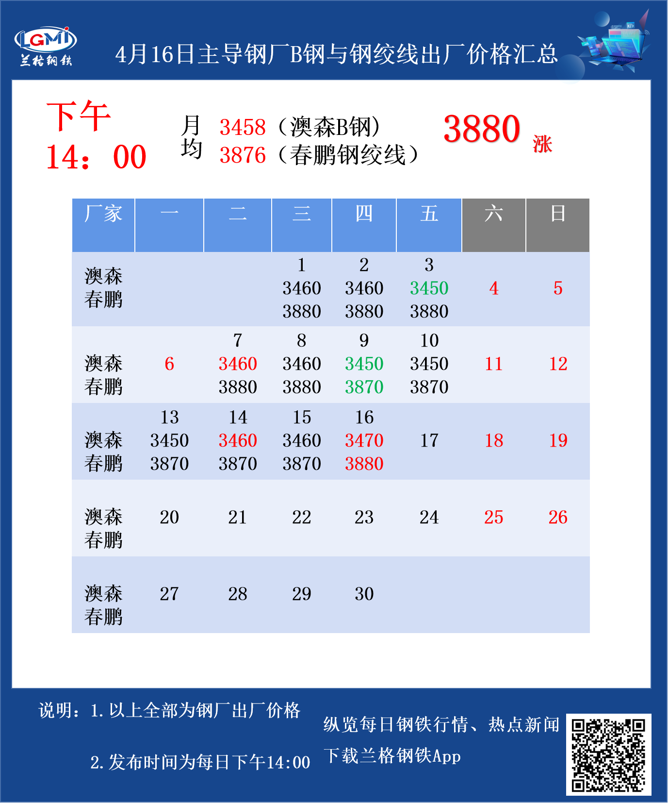 4月16日主导钢厂B钢与钢绞线出厂价格