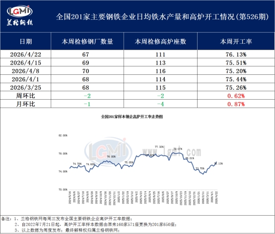 兰格调研:全国201家生产企业高炉开工数据周报(4月22日) 一、全国201家生产企业高炉开工周度数据环比上升 据兰格钢铁网监测数据显示,2026年4月22日全国201家生产企业中有67家钢厂共计111座高炉检修停产,总容积为114940立方米,较上周减少6580立方米,按容积计算主要钢铁企业高炉开工率为76.13%,较上周上升0.62个百分点。 从数据可见,目前国内各地钢厂高炉开工率连续三周小幅回升,显示出钢厂生产端呈现一定的积极态势,随着天气转暖,下游建筑工地开工率逐步提升,房地产及基建项目对钢材的需求有所释放,一定程度上带动了钢厂的生产积极性,与此同时,地缘政治不确定性导致大宗商品价格近期波动加剧,其中铁矿石等原料价格小幅探涨,导致钢厂在采购原料时面临成本不确定性,直接影响钢厂的定价决策。从市场反馈消息来看,部分钢厂在需求回暖的预期下选择适度恢复生产,但在原料成本压力下,并未出现大规模集中增产的情况,综合来看,钢厂在需求回暖与成本压力等因素的博弈下,呈现出谨慎复苏的态势,随着各地工程项目进入施工旺季,螺纹钢、线材等建筑用钢的订单量有所增加,钢厂为满足市场需求,开始逐步提高高炉开工水平,而制造业需求回暖的迹象尚不明显,汽车、家电等行业对板材的采购量仍保持相对平稳,这使得钢厂在品种结构调整上更侧重于建筑用钢的生产,结合现有宏观因素,短期内多头力量或占据一定主导,但上行空间或受成本端波动及终端需求持续性的制约,有鉴于此,预计未来一段时间内国内高炉开工率或继续保持在相对高位。