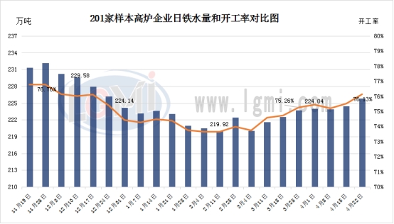 2026年4月22日,据兰格调研,全国201家生产企业铁水日均产量为225.87万吨,较上周增加1.43万吨;26年4月份日均铁水产量为224.56万吨,日均产量环比3月增加2.56万吨。 从数据可见,目前国内各地钢厂高炉开工率连续三周小幅回升,显示出钢厂生产端呈现一定的积极态势,随着天气转暖,下游建筑工地开工率逐步提升,房地产及基建项目对钢材的需求有所释放,一定程度上带动了钢厂的生产积极性,与此同时,地缘政治不确定性导致大宗商品价格近期波动加剧,其中铁矿石等原料价格小幅探涨,导致钢厂在采购原料时面临成本不确定性,直接影响钢厂的定价决策。从市场反馈消息来看,部分钢厂在需求回暖的预期下选择适度恢复生产,但在原料成本压力下,并未出现大规模集中增产的情况,综合来看,钢厂在需求回暖与成本压力等因素的博弈下,呈现出谨慎复苏的态势,随着各地工程项目进入施工旺季,螺纹钢、线材等建筑用钢的订单量有所增加,钢厂为满足市场需求,开始逐步提高高炉开工水平,而制造业需求回暖的迹象尚不明显,汽车、家电等行业对板材的采购量仍保持相对平稳,这使得钢厂在品种结构调整上更侧重于建筑用钢的生产,结合现有宏观因素,短期内多头力量或占据一定主导,但上行空间或受成本端波动及终端需求持续性的制约,有鉴于此,预计未来一段时间内国内高炉开工率或继续保持在相对高位。