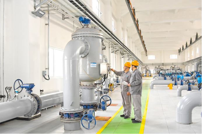 4月20日,河钢集团唐钢公司动力部职工正在检查工艺优化后的净环水过滤系统运行情况。