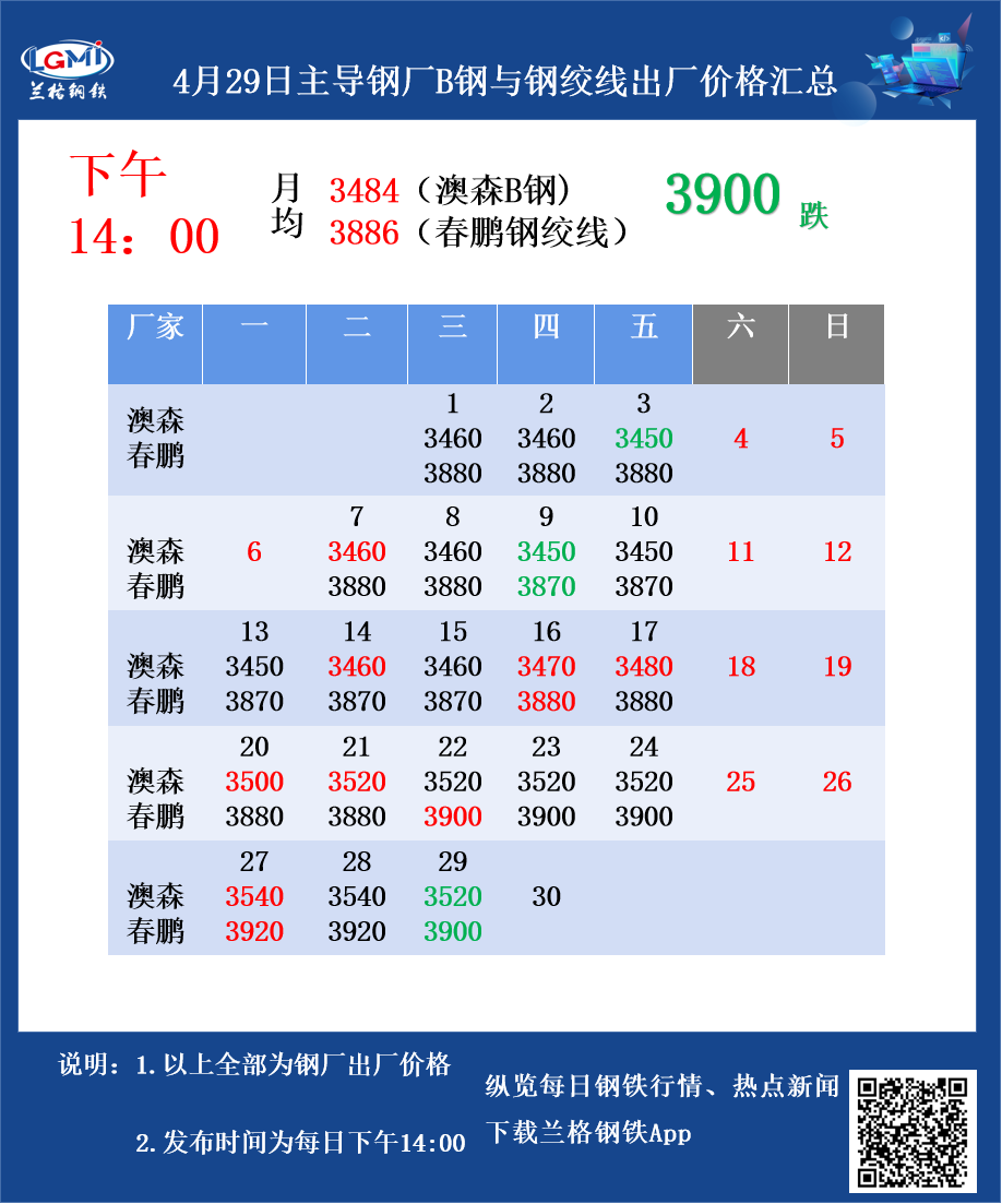 • 4月29日主导钢厂B钢与钢绞线出厂价格